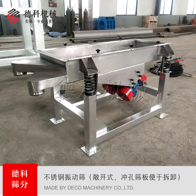 小型不銹鋼直線振動篩:便拆卸式沖孔篩板,使用沖孔篩板的網孔不小于2mm,篩分小塊及顆粒狀物料,無粉塵所以沒有上蓋。本機利用振動電機激振作為振動源,使物料在篩面上呈跳躍式直線向前運動,物料從給料機均勻地進入篩分機的進料口,通過多層篩網產生數種規格的篩上物、篩下物、分別從各自的出口排出。具有耗能低、產量高、結構簡單、易維修、全封閉結構,無粉塵溢散,自動排料,更適合于流水線作業。